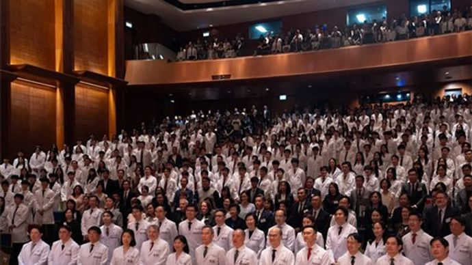 香港大学医学院27日举行白袍礼,所有医科一年级生在师长及家人的见证下,穿上代表医学专业的白袍并宣读日内瓦宣言,正式展开他们的仁医之路。
