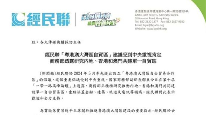 香港经民联10日表示,于2024年5月率先提出设立“粤港澳大湾区自由贸易合作区”的倡议,该重要倡议受到中央重视。