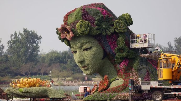 9月9日,在北京国际鲜花港花匠们正在进行最后的装点,高7.5米、长15米、宽7米的立体花坛已经显露雏形。