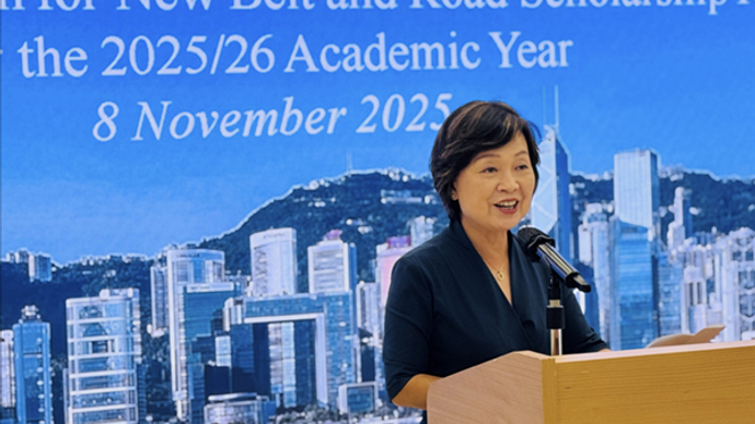 香港新闻社11月10报道 教育局局长蔡若莲8日出席“一带一路奖学金”新获奖学生年度交流分享会,与逾百名2025/26学年新获奖学生交流。