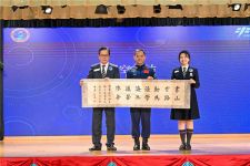 ”神舟十五号乘组航天员张陆29日上午到浸大附属王锦辉中小学访问时,特别与该校总校长陈伟佳一同展示为学校送上其以欧楷笔法撰写的书法。