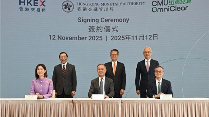 香港新闻社11月12日电 金管局、港交所及迅清结算控股今日(12日)就深化策略伙伴合作举行签约仪式。